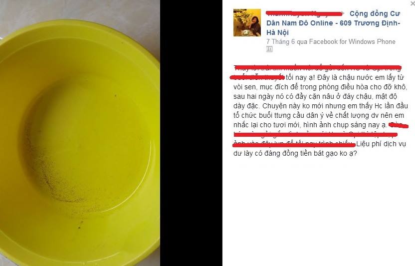Thế mà người ta cứ lờ chúng tôi đi, không coi chúng tôi ra gì. Hàng ngàn người dân, hàng trăm trẻ con, hàng chục trẻ sơ sinh phải dùng nước bẩn”, trưởng ban liên lạc ban bảo vệ quyền lợi cư dân Nam Đô Complex, ông Võ Thanh Sơn buồn bã nói.