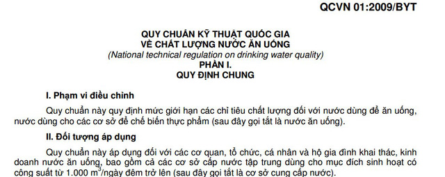 Bởi theo quy định, đối với “các cơ quan, tổ chức, cá nhân, hộ gia đình khai thác với mục đích kinh doanh, bao gồm cả các cơ sở cấp nước tập trung dùng cho mục đích sinh hoạt có công suất từ 1.000m3 nước/ngày trở lên” thì phải áp dụng theo QCVN01/2009 đối với nước ăn, uống". Theo đó, các chỉ tiêu, hàm lượng các hợp chất có trong nước phải đáp ứng các chỉ số nghiêm khắc hơn nhiều so với QCVN02:2009.